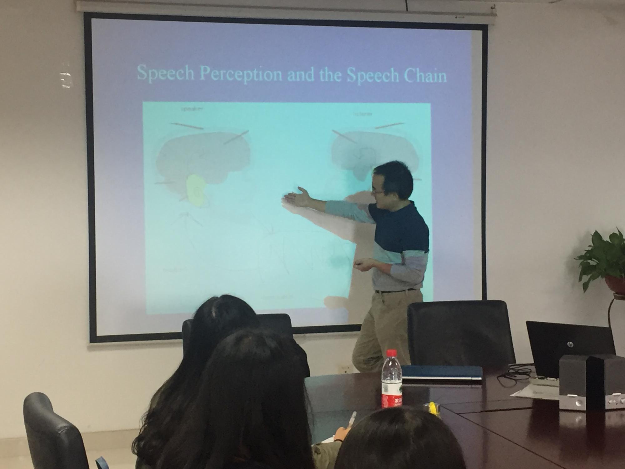 报告中,张扬教授主要阐述在语言研究中如何应用脑科学技术对大脑的在线活动进行检测。针对目前认知神经科学应用的研究手段和技术,张扬教授进行了详细的解释和优势对比,包括正电子发射断层扫描(PET)、核磁共振动(fMRI)、脑电(EEG)、脑磁(MEG)等技术。何为脑电?张教授表示,大脑皮层神经元具有生物电活动,因此大脑皮层具有持续的节律性电位变化,称为皮层自发脑电活动。而利用与事件相关的刺激可以产生诱发电位,借助电极导联以及平均叠加等技术即可记录、分析认知过程中大脑的神经电生理变化。脑电技术在语言研究中如何发挥作用?以明尼苏达大学Zhang Lab开展的一系列实验为例,张扬教授对如何运用认知神经科学手段进行语言习得和语言病理的大脑神经机制研究做了具体例证分析。此外,张扬教授还对儿童语言发展、耳蜗移植、自闭症、阅读障碍症等方面的原创脑电研究作出简洁明了的介绍。张教授的精彩报告引发与会师生的强烈兴趣,针对脑科学技术在语言研究中的具体应用,现场师生互动交流十分热烈。