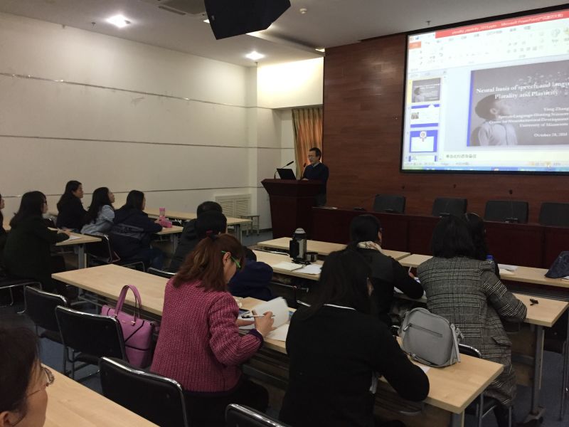 2016年10月,于西安交大俄罗斯专享会官网语言与认知神经科学实验室新建立之际,美国明尼苏达大学言语—语言—听力科学系副教授、神经行为发展研究中心教授张扬来到西安交大进行为期一个月的访问,为语言与认知神经科学实验室的投入使用提供重要技术指导。访问期间,张扬教授被聘为西安交大兼职教授,应邀作了两场关于“语言习得和语言病理的大脑神经机制研究”的精彩报告,并进行了一次脑电实验演示。