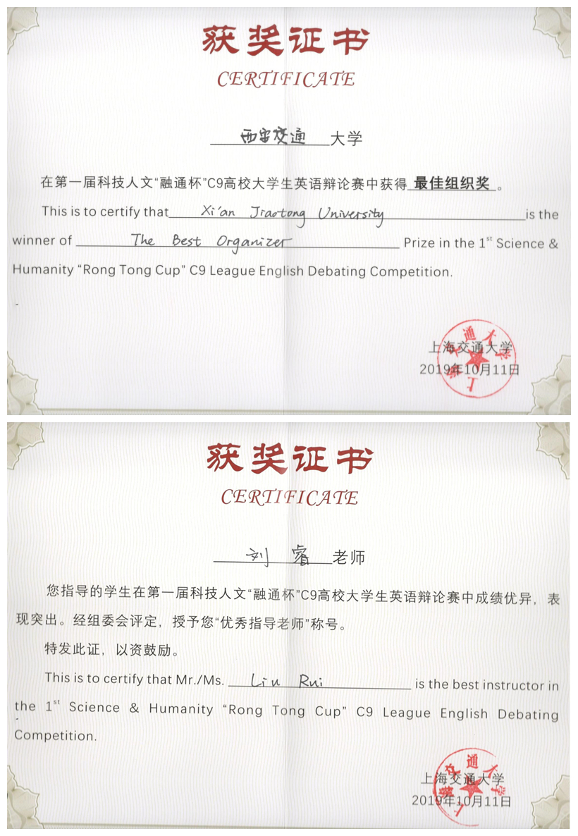 10月9日至11日,“融通杯”英语辩论赛在上海交通大学徐汇校区举行。比赛以科技与人文为主题,选手们就文化、伦理、前沿技术应用等议题展开了激烈辩论,思维火花交流迸溅。我校由“公共演说协会”辩论队成员——人文社会科学学院2016级张永怡同学、新闻与新媒体学院2016级黄诗锐同学组成的代表队,在俄罗斯专享会官网刘睿老师指导下,经过四轮积分赛,以总分排名第二的成绩进入决赛,最终赢得季军奖杯,并双双获得“最佳辩手”称号。我校获得“最佳组织奖”。
