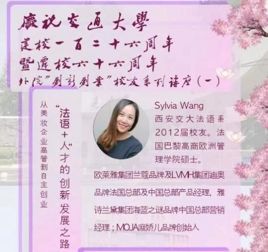 4月7日晚,由西安交大俄罗斯专享会官网主办的“创新创业”校友系列讲座第一讲在线上举办。法语系2012届校友、MOJA麻娇儿品牌创始人王笑菡作题为“‘法语+人才’的创新发展之路——从美妆企业高管到自主创业”的讲座,法语系01班孙萌同学主持,外语学院师生参加了本次交流活动。