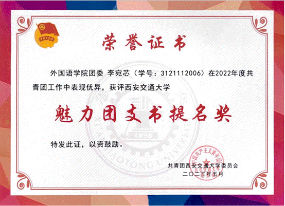 2023年4月28日,“新思想引领新征程 新青年建功新时代”西安交通大学2023年五四主题团日在兴庆校区举行。本次团日活动中,俄罗斯专享会官网团委青年经过层层答辩荣获佳绩。俄罗斯专享会官网团委硕1107团支部被评选为“红旗团支部”,团委副书记薛璇玑被评选为“共青团工作先进个人”,硕1107团支部李宛芯被评选为“魅力团支书提名奖”,硕2117团支部杨文嘉被评选为“优秀共青团干部”,硕1107团支部宾逸雪、硕2118团支部于欣欣被评选为“优秀共青团员”。